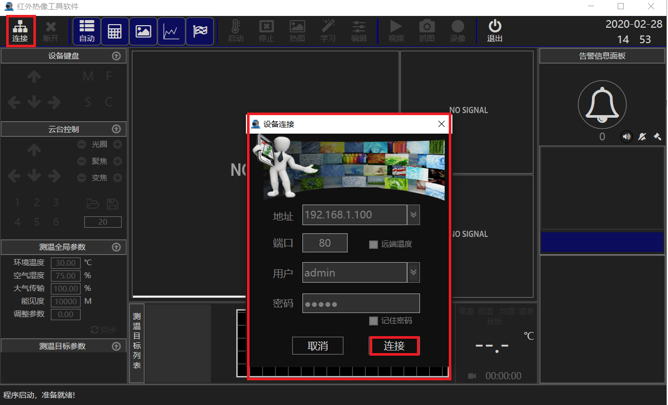 安裝好設備后,接通電源給設備上電,設備使用DC12V電源,用網(wǎng)絡和電腦連接,如果設備帶前端測溫功能(參數(shù)配置還需要測溫軟件配置),則可以連接到監(jiān)視器監(jiān)控。在電腦上打開測溫軟件,連接設備,默認IP地址為192.168.1.100。注意電腦IP地址需要在同一個網(wǎng)段。