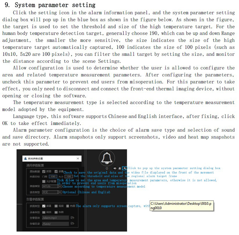 點擊告警信息面板中的設置圖標,如下圖藍框內,彈出系統(tǒng)參數(shù)設置對話框,如圖目標用于設置抓取高溫目標的門限和大小,對于人體測溫檢測目標一般選190,可以上下小范圍調整,越小越靈敏,大小表示自動抓取高溫目標的大小,100表示100個像數(shù)的大?。ㄈ?span>10x10,5x20都是100像數(shù)),可以通過設置大小過濾小目標,根據(jù)場景監(jiān)控距離設置。