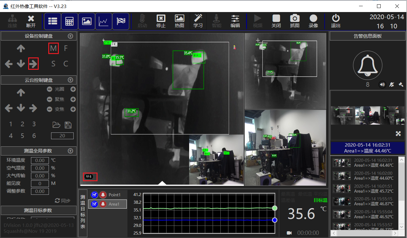 博奧智能熱像儀通過網(wǎng)絡連接PC,PC端安裝軟件,該軟件可以連接熱像視頻,可以顯示最高溫,中心點溫度;可以設置區(qū)域,自動追蹤人員并顯示溫度,可配置超溫報警,實現(xiàn)報警抓拍功能,支持通過AV視頻接口連接大屏顯示器。