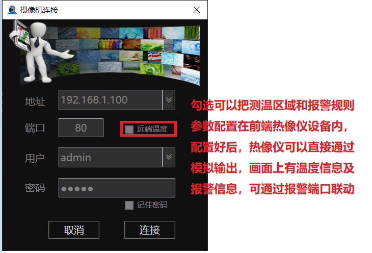 本軟件支持接入具有前端測溫功能的我司熱像產品,登入設備的時候勾選遠端測溫即可(需要前端熱像儀支持此功能),設置方法參考上面說明,配置成功后熱像可以通過模擬輸出連接監(jiān)視器監(jiān)控測溫,監(jiān)控畫面可顯示配置的區(qū)域及目標溫度。產生告警,畫面右上角會有報警圖標,報警信號也可以通過熱像報警輸出口外接報警設備。