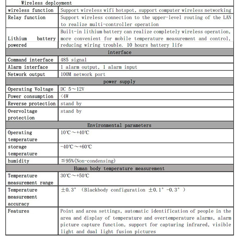 無線雙光融合人體高精度測溫儀,具有雙光融合功能,可快速準確地分辨溫度異常人員,可輸出無線/有線網(wǎng)絡信號,配合后臺PC測溫軟件,可實現(xiàn)非接觸快速大流量人體溫度異常篩選功能,采用最新智能測溫模型,無擋片成像方式,可以連續(xù)不間斷對目標人群進行溫度檢測,測溫精度可達±0.3°(配置黑體可達±0.1°-0.3°)。