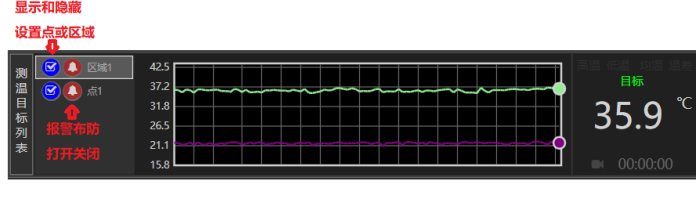 軟件具有告警布防功能,默認打開,在軟件下方測溫目標列表,可以配置設置的區(qū)域的布防開關,還可以顯示和隱藏熱像視頻中設置的測溫點和區(qū)域。選中某個區(qū)域,下方可顯示該區(qū)域的最高溫及統(tǒng)計曲線。