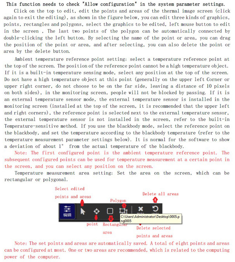 點擊上方編輯,編輯熱像畫面的點和區(qū)域(再次點擊編輯退出編輯),如下圖,可以編輯三種圖形,點、矩形和多邊形,選擇需要編輯的圖形,鼠標左鍵在畫面中編輯即可,多邊形最后兩點通過雙擊左鍵可以自動連接。通過選中點或區(qū)域名稱,可以拖動點或區(qū)域位置,選中后也可通過刪除按鈕刪除點或區(qū)域。