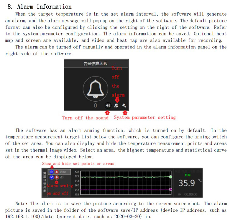 注:報警是按屏幕截屏的方式保存圖片的,報警圖片保存在軟件save/IP地址(設備IP地址,如:192.168.1.100)/日期(當前日期,如:2020-03-20)的文件夾里。