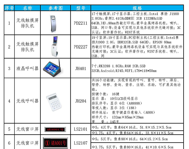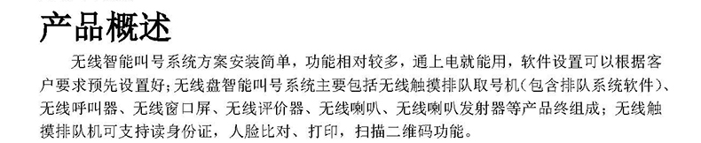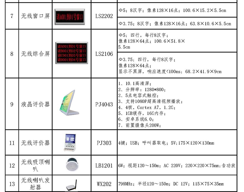 產(chǎn)品配置:無線觸摸屏排隊機(jī) 液晶呼叫器 無線呼叫器 無線窗口屏 無線綜合屏 無線評價器 無線吸頂喇叭 液晶窗口顯示屏 液晶集中顯示屏