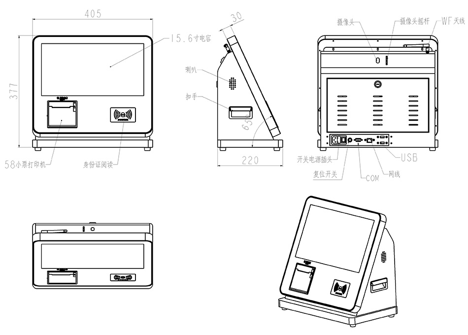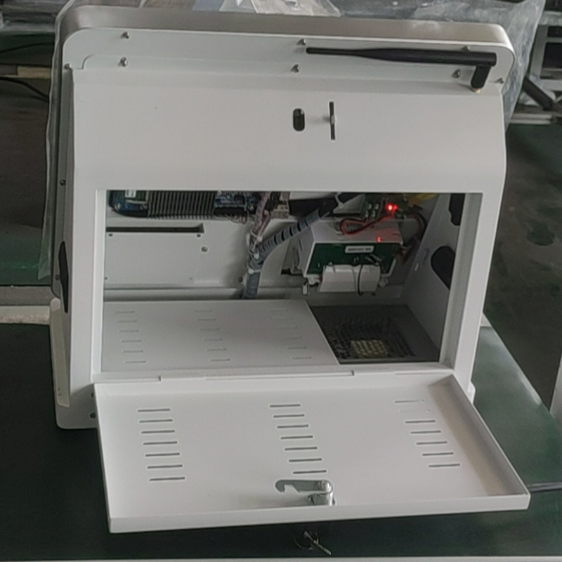 15.6寸臺式多功能一體機可應用到學校、機關、企業(yè)、工廠、醫(yī)院等場所門衛(wèi)大廳做訪客登記系統(tǒng)、社保查詢終端,產(chǎn)品外殼采用鈑金,表面烤漆工藝,設備集成15.6觸顯一體屏,身份證閱讀器、IC卡讀寫器、熱敏打印機、條碼掃描儀、社保讀卡器、攝像頭等模塊;可安裝WIN系統(tǒng)和安卓系統(tǒng),從而方便了軟件系統(tǒng)集成商開發(fā)應用,同時支持定制;包括外觀結構功能定制。