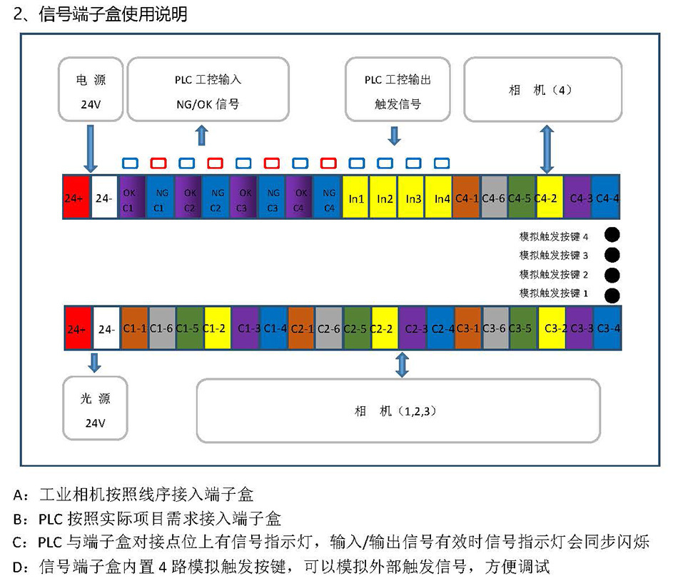 ??? 應用到各行各業(yè)工業(yè)自動化設備上,可以接視頻系統(tǒng)、PLC、電源、光源等引線。