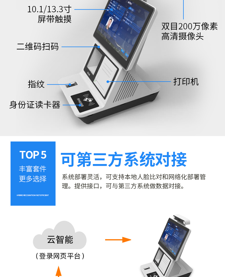 單屏智能訪客機(jī)系列產(chǎn)品,搭配13.3寸雙面LCD顯示屏幕(可選10.1寸),內(nèi)嵌深度學(xué)習(xí)人臉識別算法。內(nèi)嵌身份證解密模塊和指紋模塊。該產(chǎn)品具備人臉檢測、人證比對、活體判斷等強(qiáng)大功能??捎行椭脩艄芾碓L客出入人員權(quán)限,有助于防范疫情。所有數(shù)據(jù)既可脫機(jī)管理,也可以連上云平臺。也可搭配人臉面板機(jī)聯(lián)動,實(shí)現(xiàn)訪客出入無紙化。可廣泛應(yīng)用于小區(qū)門口、學(xué)校出入口、酒店入住,以及寫字樓等場景!