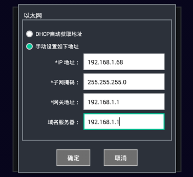 終端網(wǎng)絡(luò)配置可以選擇以太網(wǎng)、WiFi和移動網(wǎng)絡(luò)中的一種并配置相應(yīng)的參數(shù)。以太網(wǎng)設(shè)置界面如下圖所示,可以選擇DHCP自動獲取地址(局域網(wǎng)中有DHCP服務(wù)器則建議使用)或者手動設(shè)置如下地址(局域網(wǎng)中午DHCP服務(wù)器或者不允許使用動態(tài)地址時使用)。