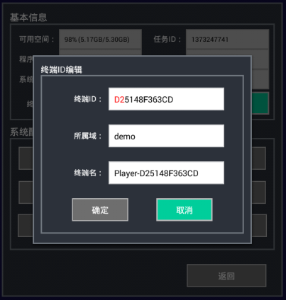 終端基本信息中的[設(shè)置]按鈕彈出界面如下圖所示,可進(jìn)行終端ID、所屬域、終端名稱的編輯。終端所屬域定義了終端在服務(wù)器的在哪個域中可見,如果為空則默認(rèn)為demo域。請注意:如果服務(wù)器強(qiáng)制將終端錄入到了某個域,則終端一旦聯(lián)網(wǎng)就會自動轉(zhuǎn)換到相應(yīng)的域