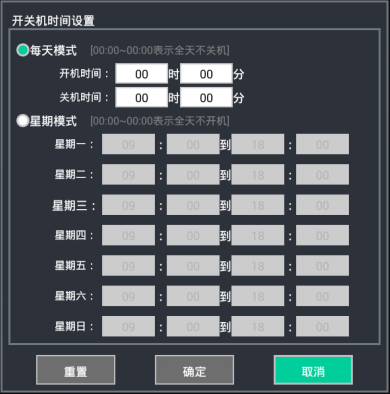 開關(guān)時間設(shè)置用于設(shè)定終端機(jī)的定時開關(guān)機(jī)時間,包括每天模式和星期模式兩種模式。每天模式指定終端機(jī)每天的開機(jī)時間點(diǎn)和關(guān)機(jī)時間點(diǎn);全天不關(guān)機(jī)則設(shè)定為00:00~00:00。星期模式指定終端機(jī)每周天的具體開關(guān)機(jī)時間;某個周天不開機(jī)則設(shè)定為00:00~00:00。