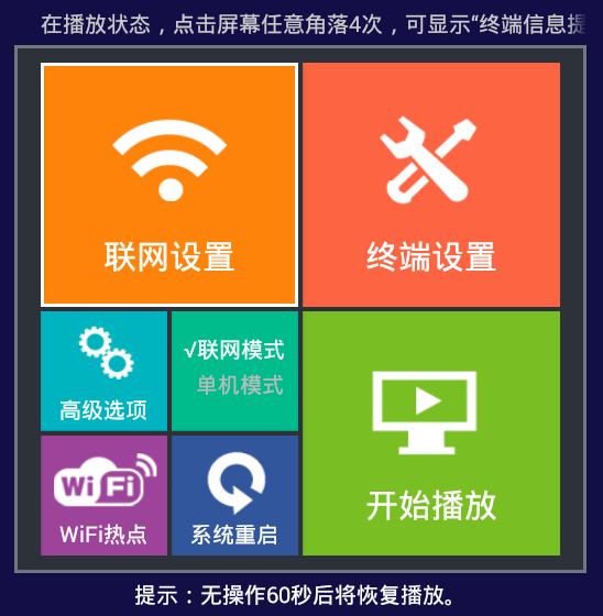 終端后臺設(shè)置界面包括7個子功能按鈕(注:若軟件界面有差異是因?yàn)槲锤碌阶钚掳姹?,但不影響使用可以忽略):?lián)網(wǎng)設(shè)置、終端設(shè)置、高級選項(xiàng)、聯(lián)網(wǎng)/單機(jī)模式、WiFi熱點(diǎn)、系統(tǒng)重啟和開始播放。