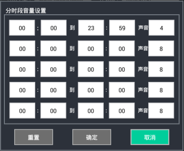 音量設(shè)置界面如下圖所示,最多可指定5個不同時段的音量,默認(rèn)情況下全天不分時段則只需要指定第一段00:00~23:59的音量值。