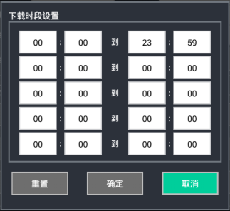 下載時段設(shè)置界面如下圖所示,最多可設(shè)置五個終端機(jī)的下載時段,00:00~00:00表示空配置項(xiàng),00:00~23:59表示全天均可下載。終端機(jī)只有在配置的下載時段內(nèi)才會從服務(wù)器下載同步節(jié)目內(nèi)容;而配置、程序和系統(tǒng)包的下載不受下載時間限制。