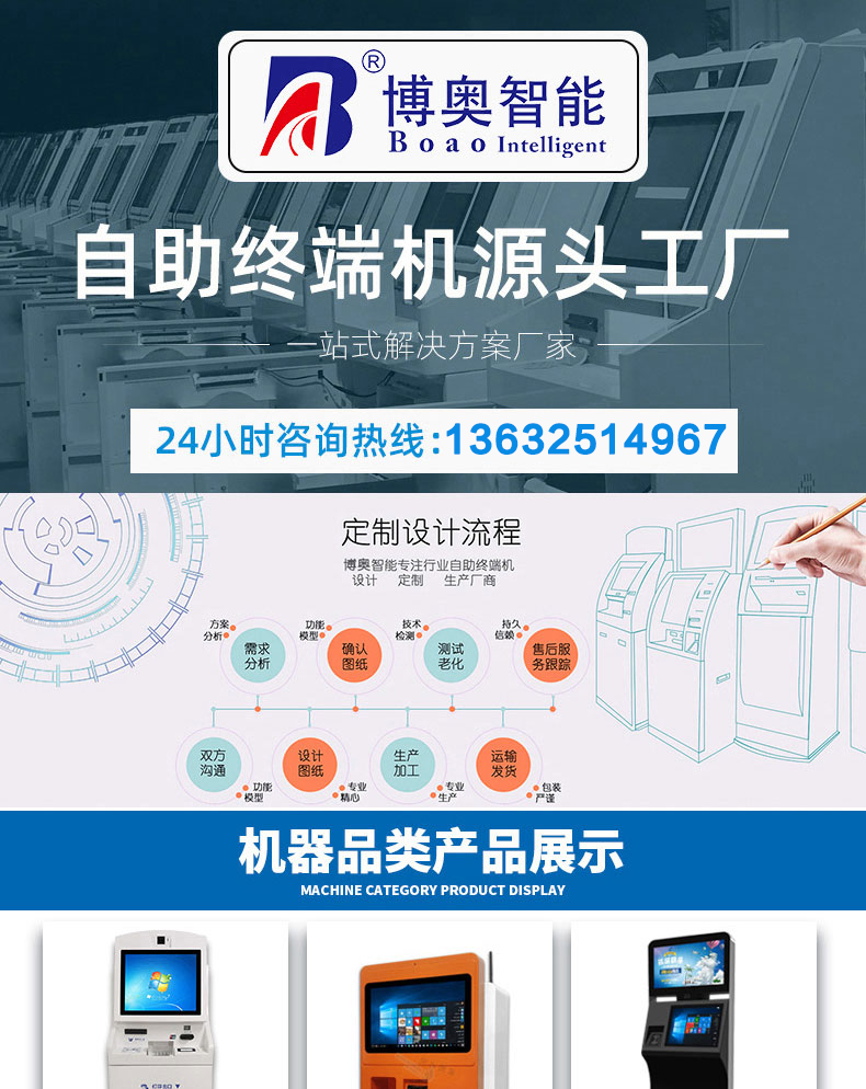 專業(yè)提供電腦觸控產(chǎn)品、自助服務(wù)終端的設(shè)計(jì)及生產(chǎn)服務(wù),主要產(chǎn)品自助終端機(jī)、自助打印機(jī)、自助取票機(jī)、自助查詢機(jī)、自助繳費(fèi)機(jī)、自助發(fā)卡機(jī)、自助政務(wù)一體機(jī),產(chǎn)品使用于各個行業(yè);醫(yī)院、學(xué)校、銀行、酒店、景區(qū)等。。。。。公司擁有專業(yè)的生產(chǎn)線,嚴(yán)格的質(zhì)量把控。耐心的咨詢服務(wù)團(tuán)隊(duì)及專業(yè)的技術(shù)負(fù)責(zé)團(tuán)體。