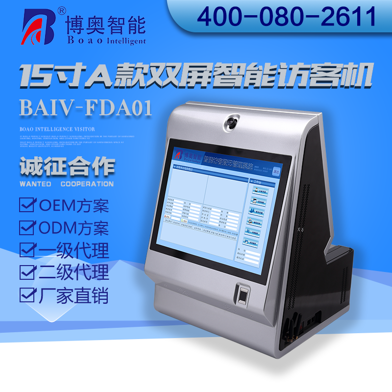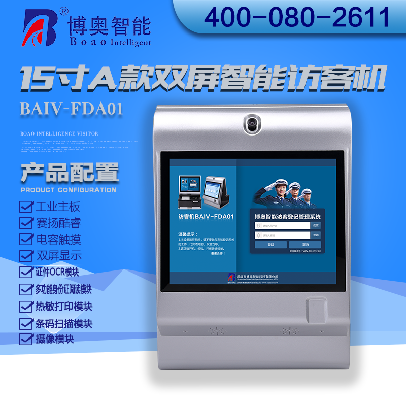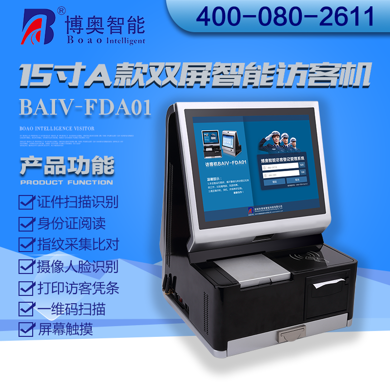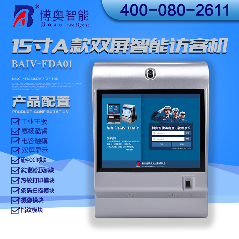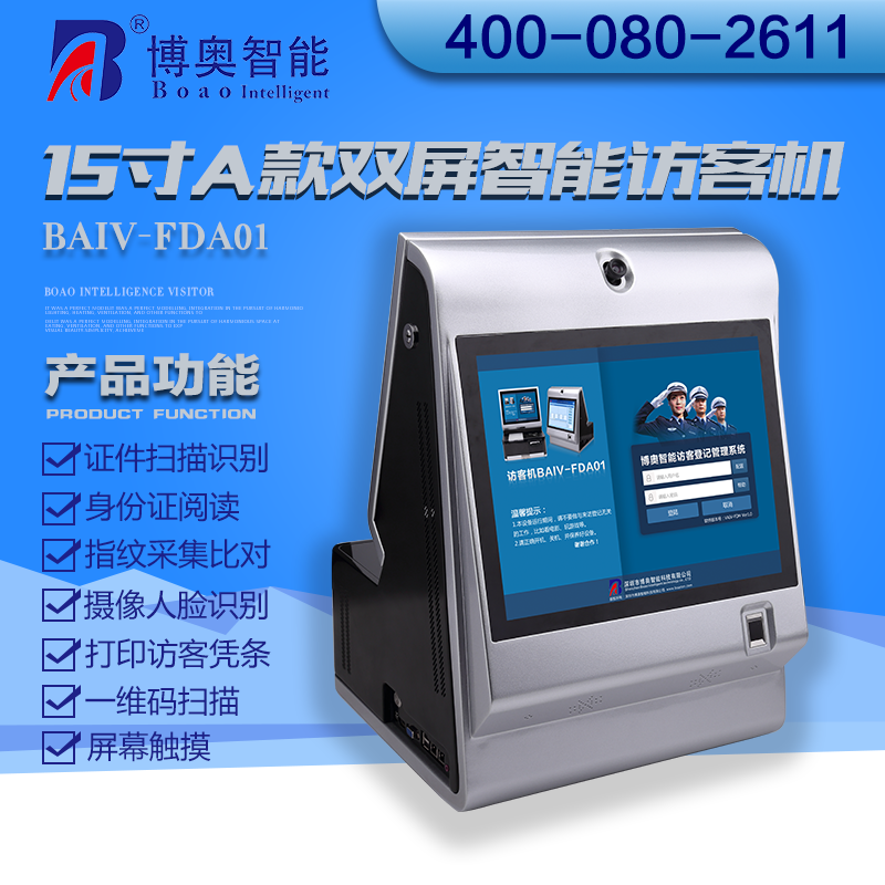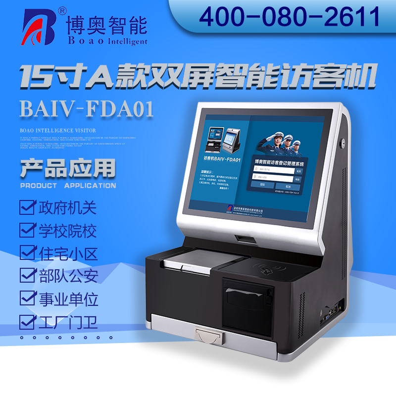 ? ? ? ?15寸A款雙屏智能訪客機(jī)主要用在政府機(jī)關(guān)、關(guān)口、機(jī)場(chǎng)、軍隊(duì)、公安、法院、學(xué)校、事業(yè)單位、花園小區(qū)、高檔寫字樓、工廠等門衛(wèi)傳達(dá)室用來(lái)訪客登記管理。