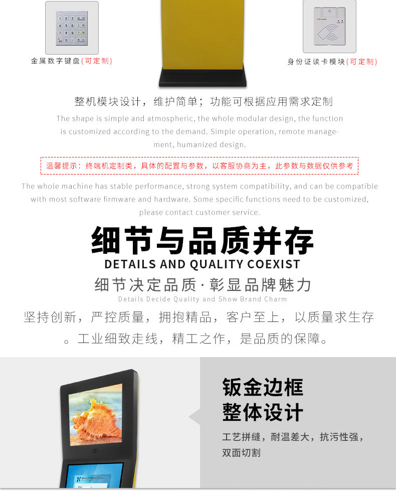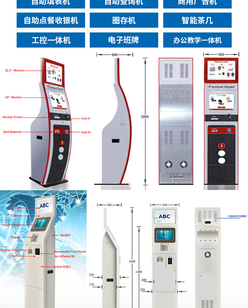 定制實(shí)用的自助終端設(shè)備,我們是專業(yè)。多種定制款式任意選擇,可根據(jù)需求定制外觀屏幕尺寸可選,配件數(shù)量可選,主機(jī)配置可選。