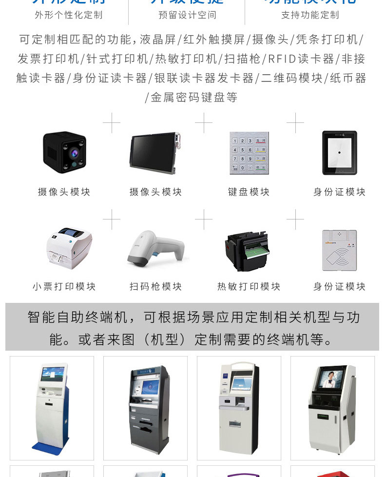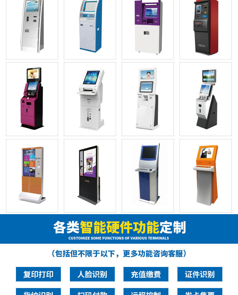 專業(yè)提供電腦觸控產(chǎn)品、自助服務(wù)終端的設(shè)計(jì)及生產(chǎn)服務(wù),主要產(chǎn)品自助終端機(jī)、自助打印機(jī)、自助取票機(jī)、自助查詢機(jī)、自助繳費(fèi)機(jī)、自助發(fā)卡機(jī)、自助政務(wù)一體機(jī),產(chǎn)品使用于各個(gè)行業(yè);醫(yī)院、學(xué)校、銀行、酒店、景區(qū)等。。。。。公司擁有專業(yè)的生產(chǎn)線,嚴(yán)格的質(zhì)量把控。耐心的咨詢服務(wù)團(tuán)隊(duì)及專業(yè)的技術(shù)負(fù)責(zé)團(tuán)體。