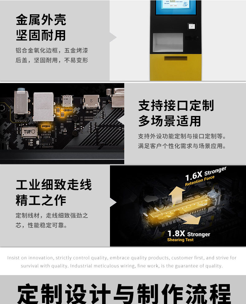 公司成產(chǎn)以“誠信、團(tuán)結(jié)、務(wù)實(shí)、創(chuàng)新”的企業(yè)精神開拓市場、優(yōu)化產(chǎn)品細(xì)節(jié)提供舒適的自助體驗(yàn)。公司本著“誠信為本,質(zhì)量至上”的取勝之道不斷開發(fā)自助終端在各行業(yè)的應(yīng)用,打造方便快捷的一站式服務(wù)。
