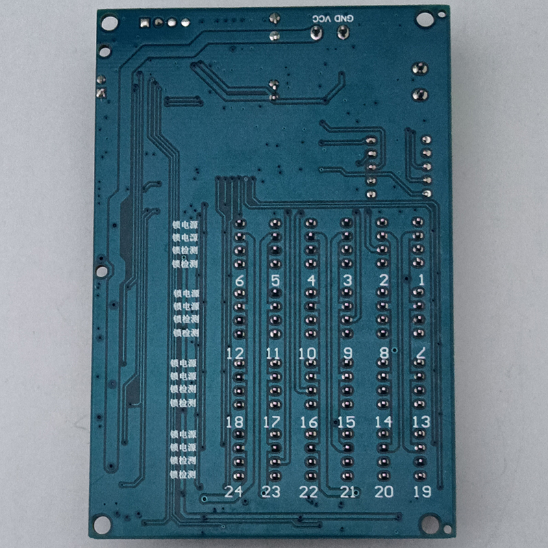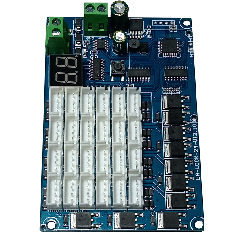 24路鎖控板又名為電子鎖控制模塊,主要用來控制各類格子柜門電子鎖的開與關(guān),板子集成24路鎖控杜邦接口,485通信接口,DC電源接口,鎖控地址顯示模塊,一鍵全開功能!板子通過485通信協(xié)議,實現(xiàn)電腦串口助手發(fā)送數(shù)據(jù)開鎖和獲取箱門狀態(tài)反饋!