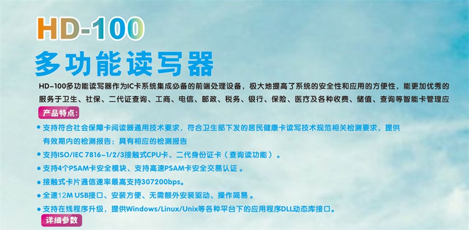 產品采用 RFID技術,可支持社保卡、二代證、一代證的讀取和寫入;支持金融 IC卡讀寫;支持銀聯(lián)在線支付;可用于身份識別和驗證;可應用于金融領域、交通領域、社保領域、一卡通領域等。